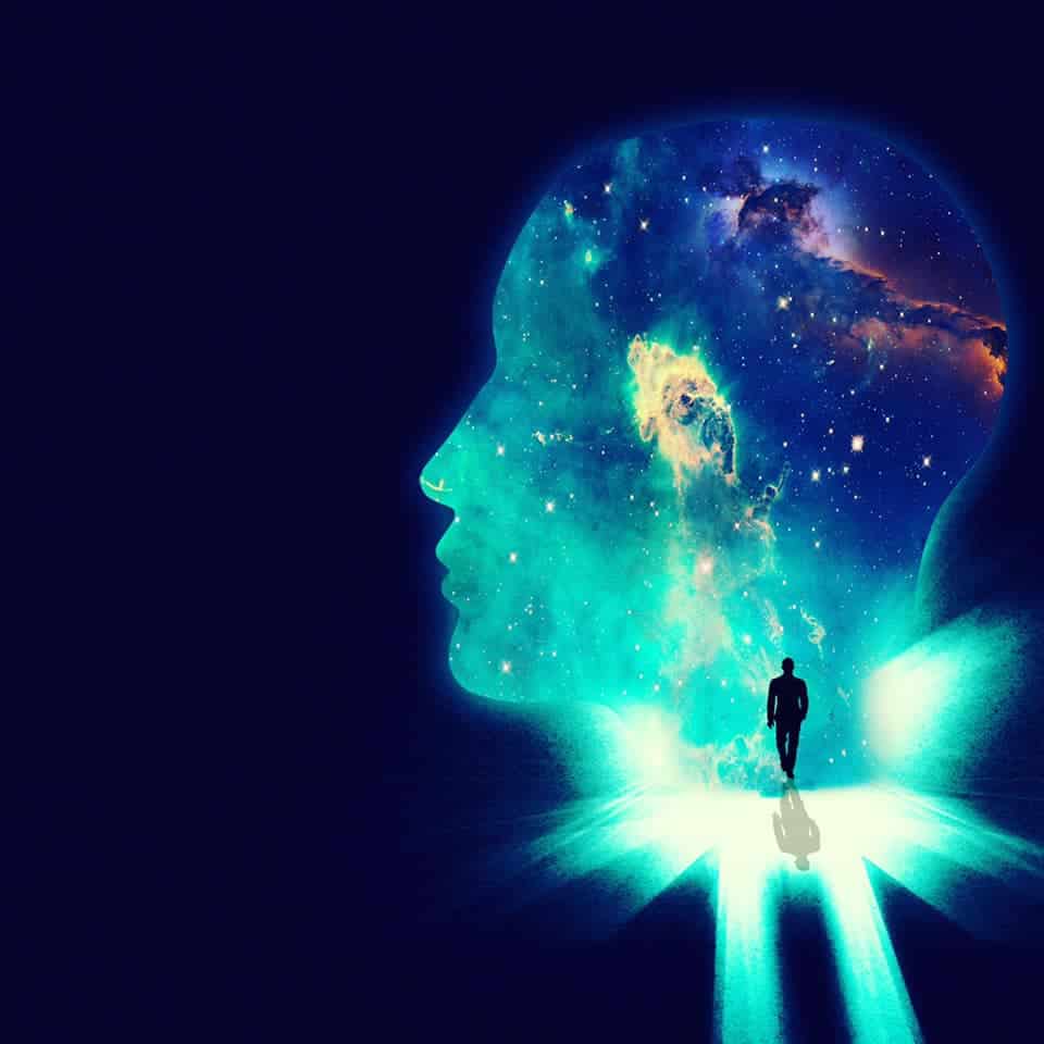 Illustration of a man walking towards a huge shape of a person’s head overlaid with an image of the cosmos